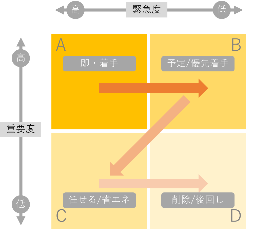 領域 A =[重要度:高]×[緊急度:高]とする左上の象限が最優先に着手する領域です。